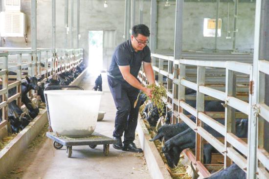 一栋栋羊舍敞亮整洁,一只只小羊膘肥体壮,走进位于大足区三驱镇的重庆黑羊羊农产品贸易有限公司养殖场的养羊大棚,羊叫声此起彼伏,江先海正忙着给黑山羊投喂草料,清理食槽,羊舍内干净整洁,通风良好,一只只小羊羔凑在食槽前,正在享受着“健康午餐”。这幅活力满满的画面背后,是一位新农人用勤奋与执着书写的返乡创业故事。