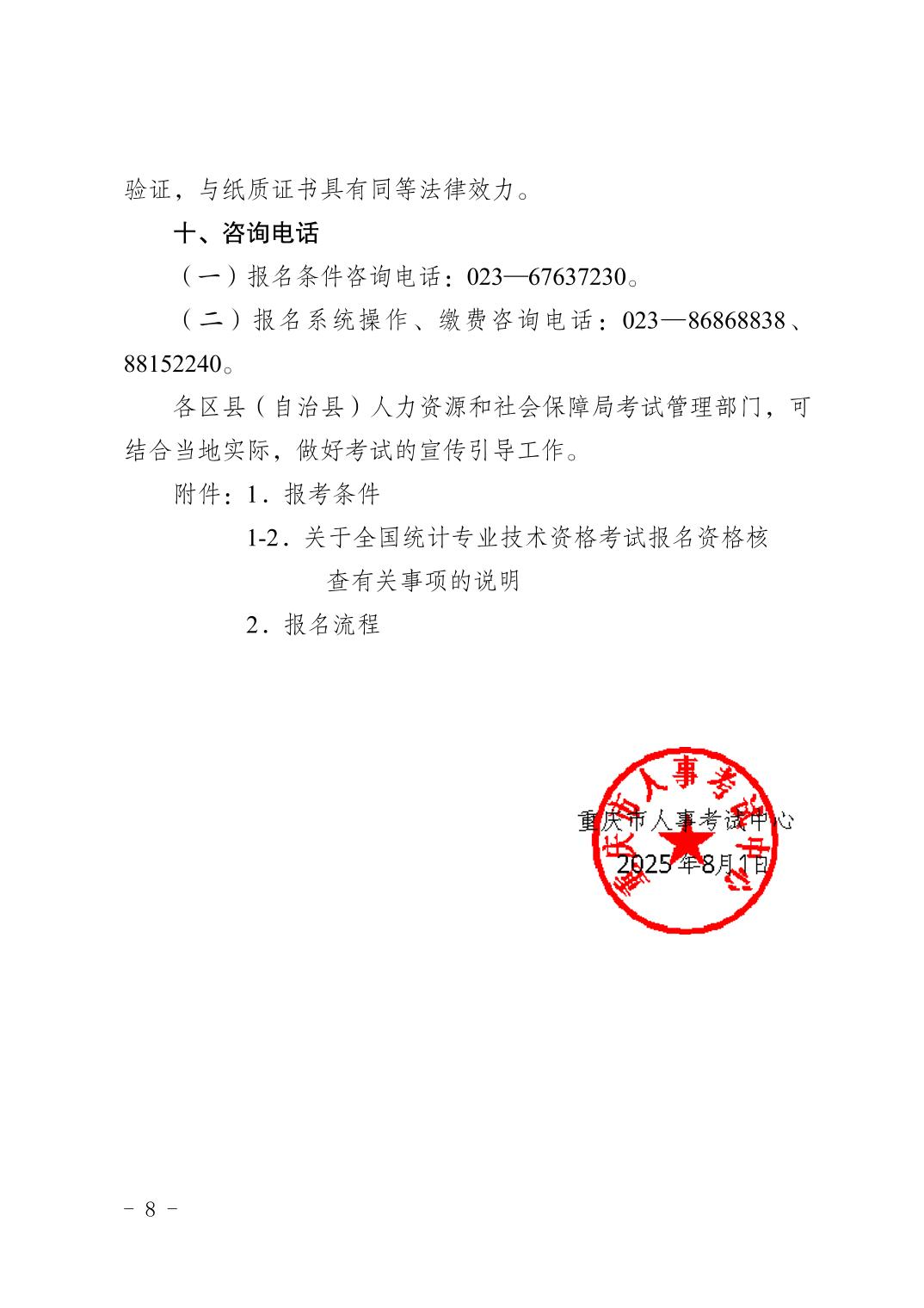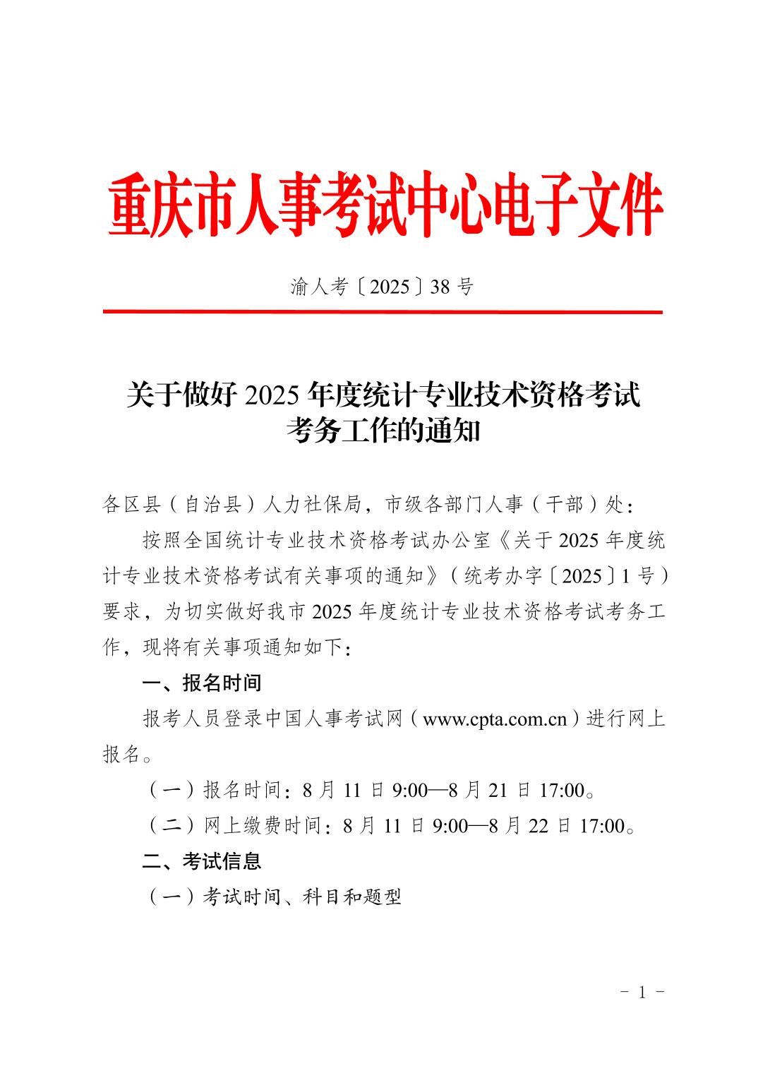 现将《重庆市人事考试中心关于做好2025年度统计专业技术资格考试考务工作的通知》(渝人考〔2025〕38号)转发给你们,请各行业主管部门、各单位高度重视,积极组织符合条件人员参加考试。