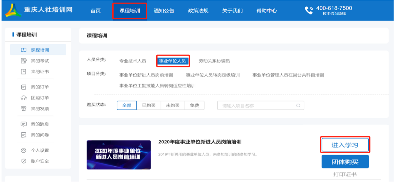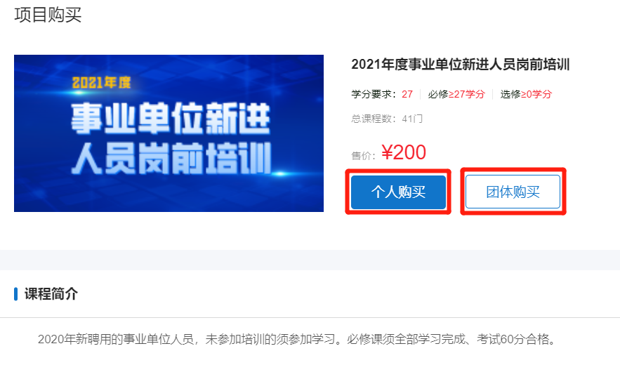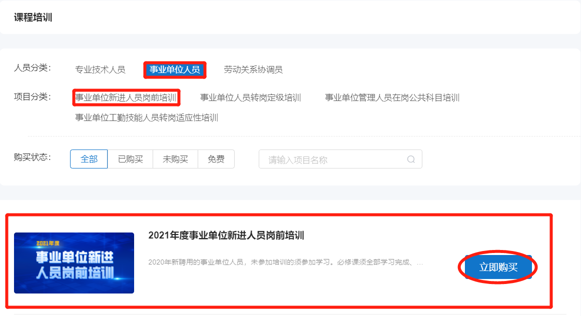 一)登录进入网络学习平台,点击“课程培训”,在人员分类中选择“事业单位人员”,然后在项目分类中选择“事业单位新进人员岗前培训”,找到“2021年度事业单位新进人员岗前培训”项目,点击“立即购买”。