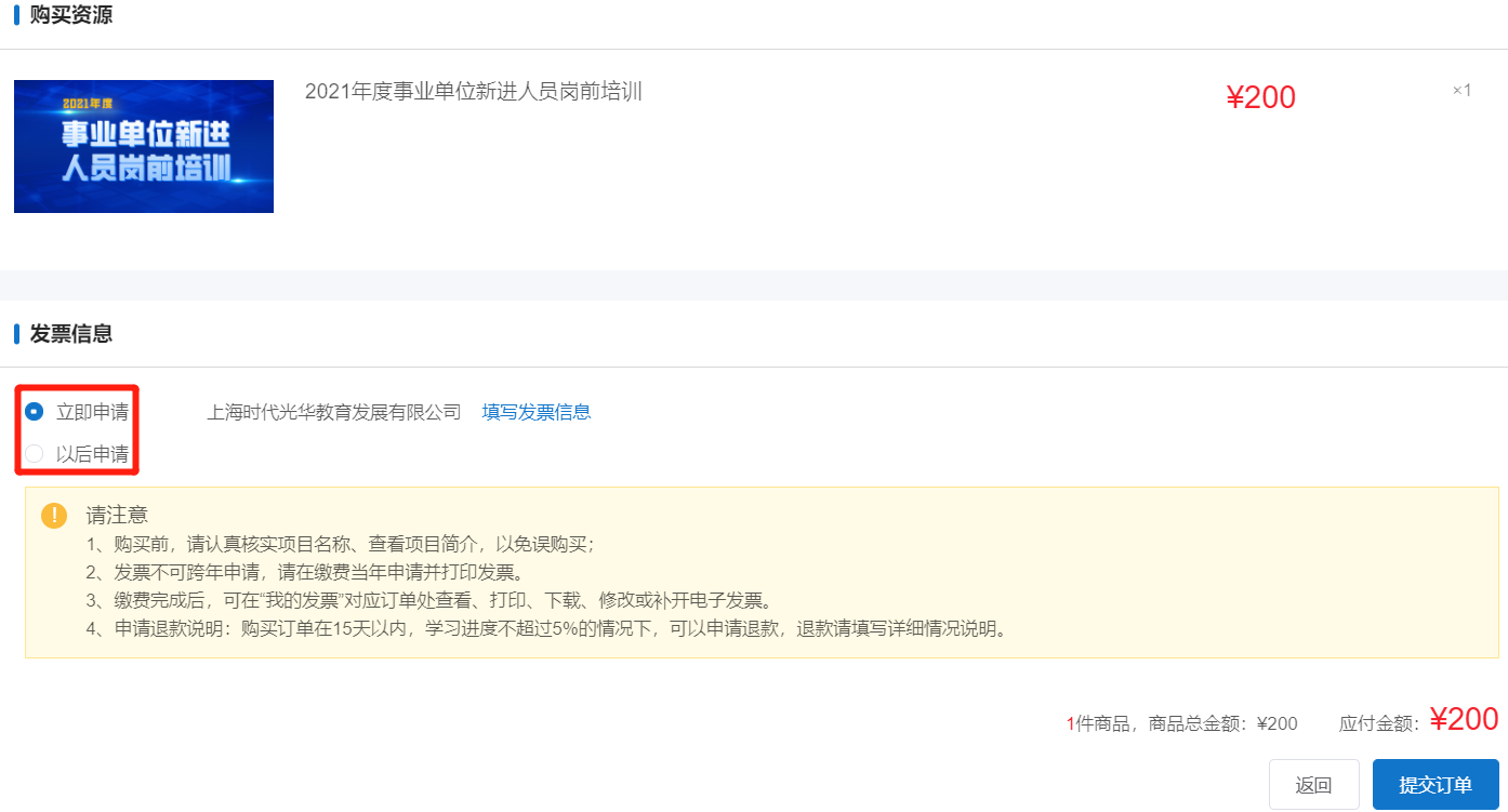 (二)提交订单,申请发票。在订单提交页面,可以选择“立刻申请”发票,或点击“以后申请”发票。缴费成功后,在“我的订单”中(团体购买在“团购订单”中)的对应订单处,进行查看发票或补开发票等操作。(详见第五节电子发票)