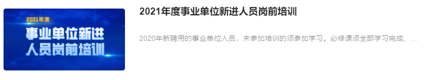 2.选择“2021年度事业单位新进人员岗前培训”,点击“进入学习”进入培训课程展示页面;