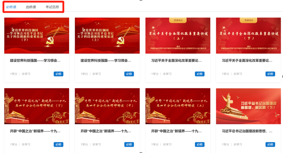 3.在学习课程展示页面,点击必修课、选修课、考试信息可进行切换,点击相应课程名称进入课程观看页面。