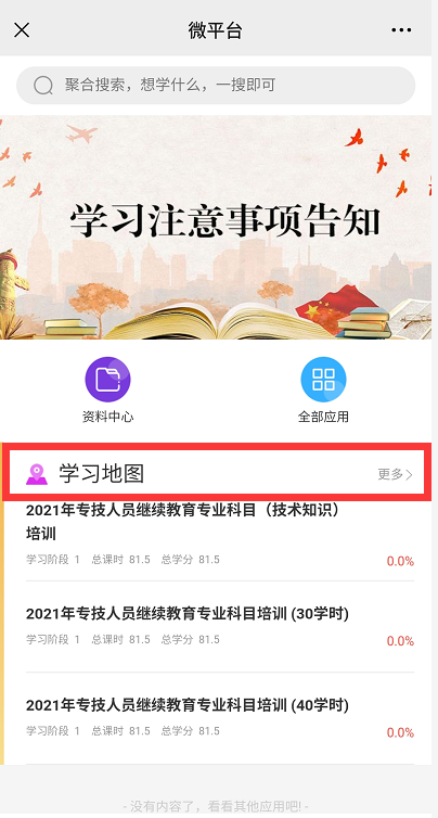 通过微信公众号进入登录页面,输入用户名及密码(用户名及密码同PC端)即可登录。登录后选择已经购买的学习地图进入到课程展示页面(点击更多,上下滑动选择)。