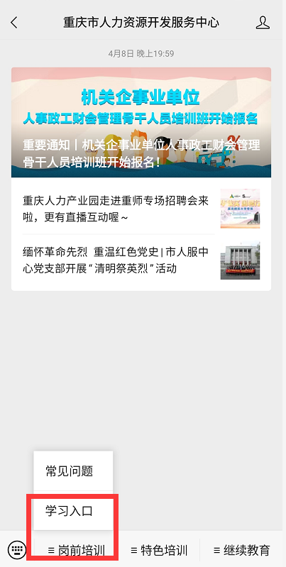 1.关注微信公众号:通过搜索“重庆市人力资源开发服务中心”或者扫描下方二维码关注市人服中心微信公众号。