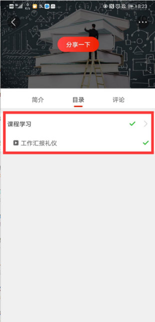 课程/章节后有绿色的小勾表示该课程/章节已经学习完成。