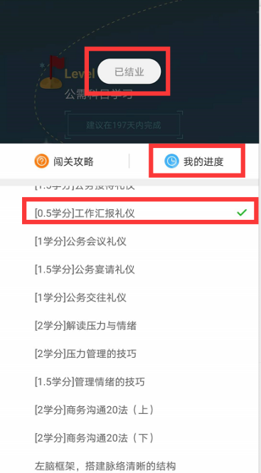 在课程展示页面点击“我的进度”可以查询目前学分完成情况。达到学习要求后会显示“已结业”。