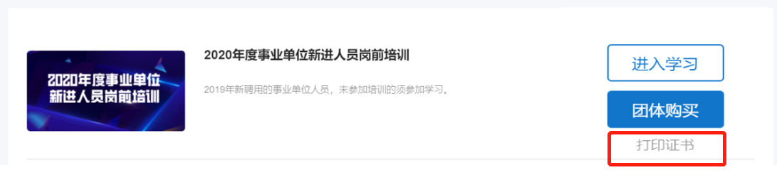 完成“2021年度事业单位新进人员岗前培训”课程学习要求(完成所有必修课程学习且考试合格)后,返回PC端“课程培训”展示首页,点击“打印证书”。