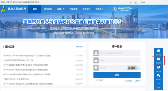 (二)在线客服:在学员界面的右方侧边栏选择在线咨询,可进行操作咨询。