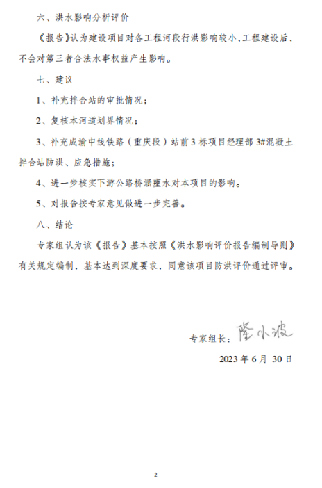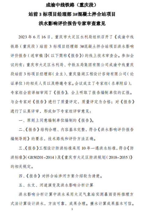 附件:1. 成渝中线铁路(重庆段)站前3标项目经理部3#混凝土拌合站工程洪水影响评价报告专家评审意见