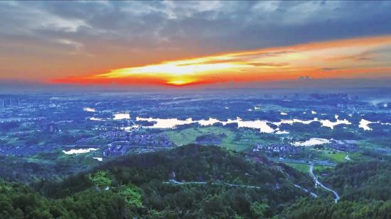 8月27日傍晚,夕阳渐沉,大足龙水湖上空被染成橘红、粉紫交织的渐变色,晚霞余晖洒向湖面,波光粼粼如碎金闪烁。远眺而去,108座小岛星罗棋布,与远山轮廓相融成水墨画卷。
