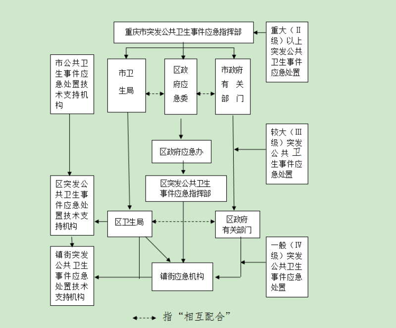 2.1.1.1 在大足区人民政府应急管理委员会(简称区政府应急委)的统一领导下和大足区人民政府应急管理办公室(简称区政府应急办)的统筹协调下,大足区人民政府突发公共卫生事件应急指挥部(简称区卫生应急指挥部)具体组织领导全区突发公共卫生事件应急管理工作。