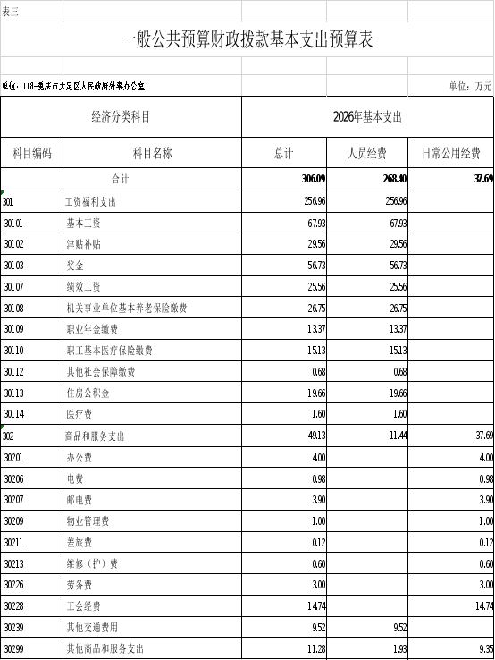 2026年一般公共预算财政拨款收入354.09万元,一般公共预算财政拨款支出354.09万元,比2026年减少63.76万元。其中:基本支出306.09万元,比2026年增加36.24万元,下属事业单位增加专业技术人员1名和部门其他职工职务职级晋升,主要用于保障区政府外办及区外事服务中心在职人员工资福利及社会保险缴费,保障部门正常运转的各项商品服务支出;项目支出48万元,比2026年减少100万元,主要原因是按照区委、区政府安排取消统筹管理大足区外事专项经费的归口项目,项目资金主要用于外事接待、涉外活动开展、友城建设、因公出访、外资招商、宣传培训等重点工作。