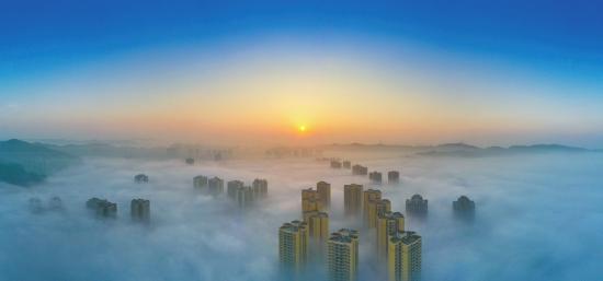 12月5日,大足区城区出现平流雾景观,山峦、楼宇、道路被云雾环绕,若隐若现。晨光照耀下,如水墨画一般。