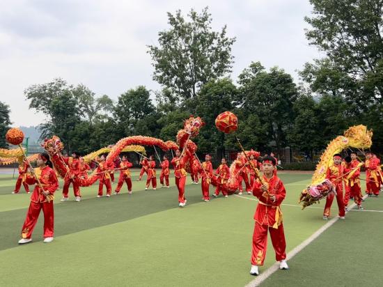 “咚咚锵!”鼓点声震天响,领头的四名小学生脸颊通红,额头上沁出细密的汗珠,竹竿头上的龙宝在他们手中灵活转动,四条金红相间的火龙在操场上舞动。龙头高高昂起,龙眼炯炯有神,龙身随着节奏不时上下翻飞,引得围观师生满堂喝彩。