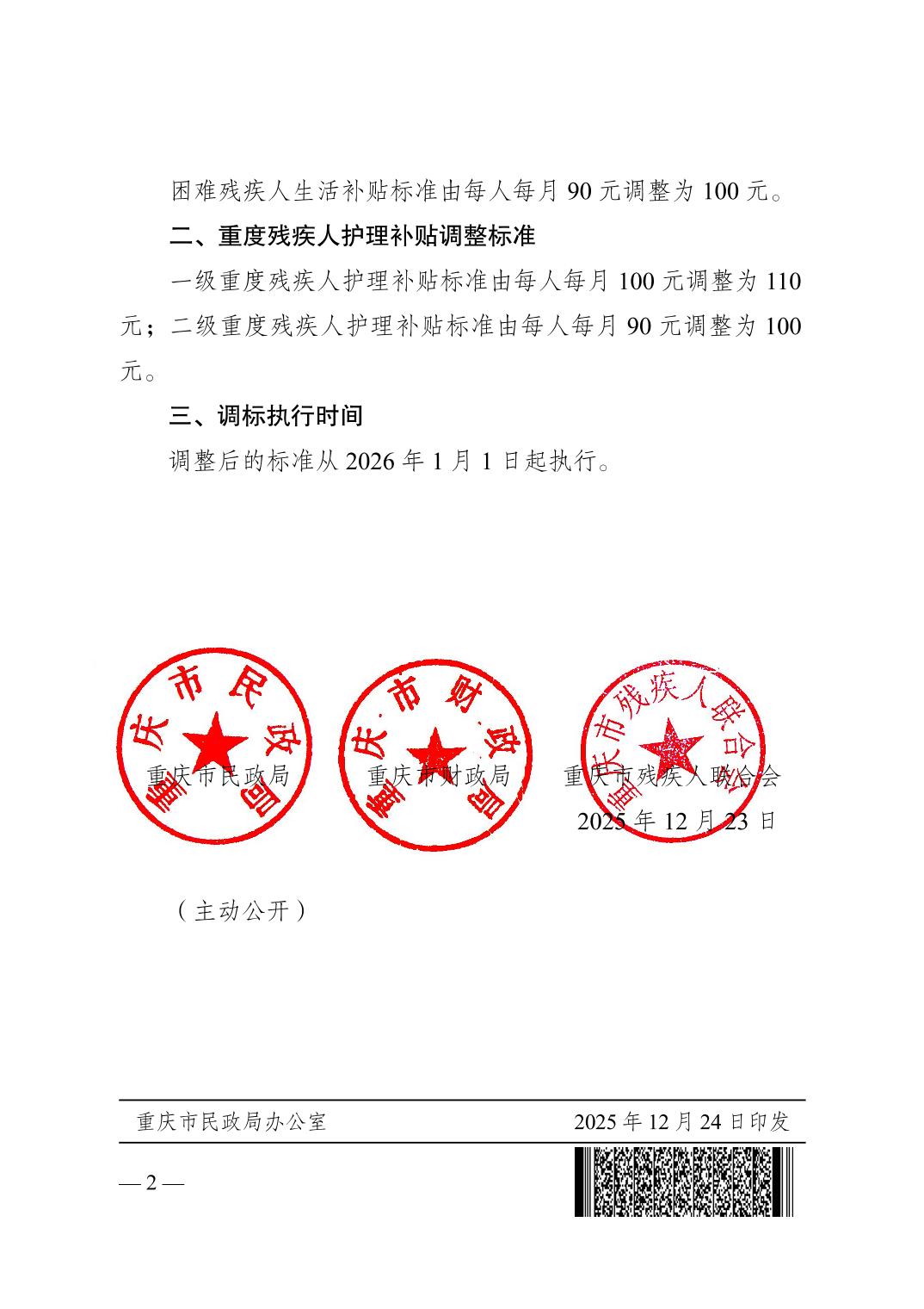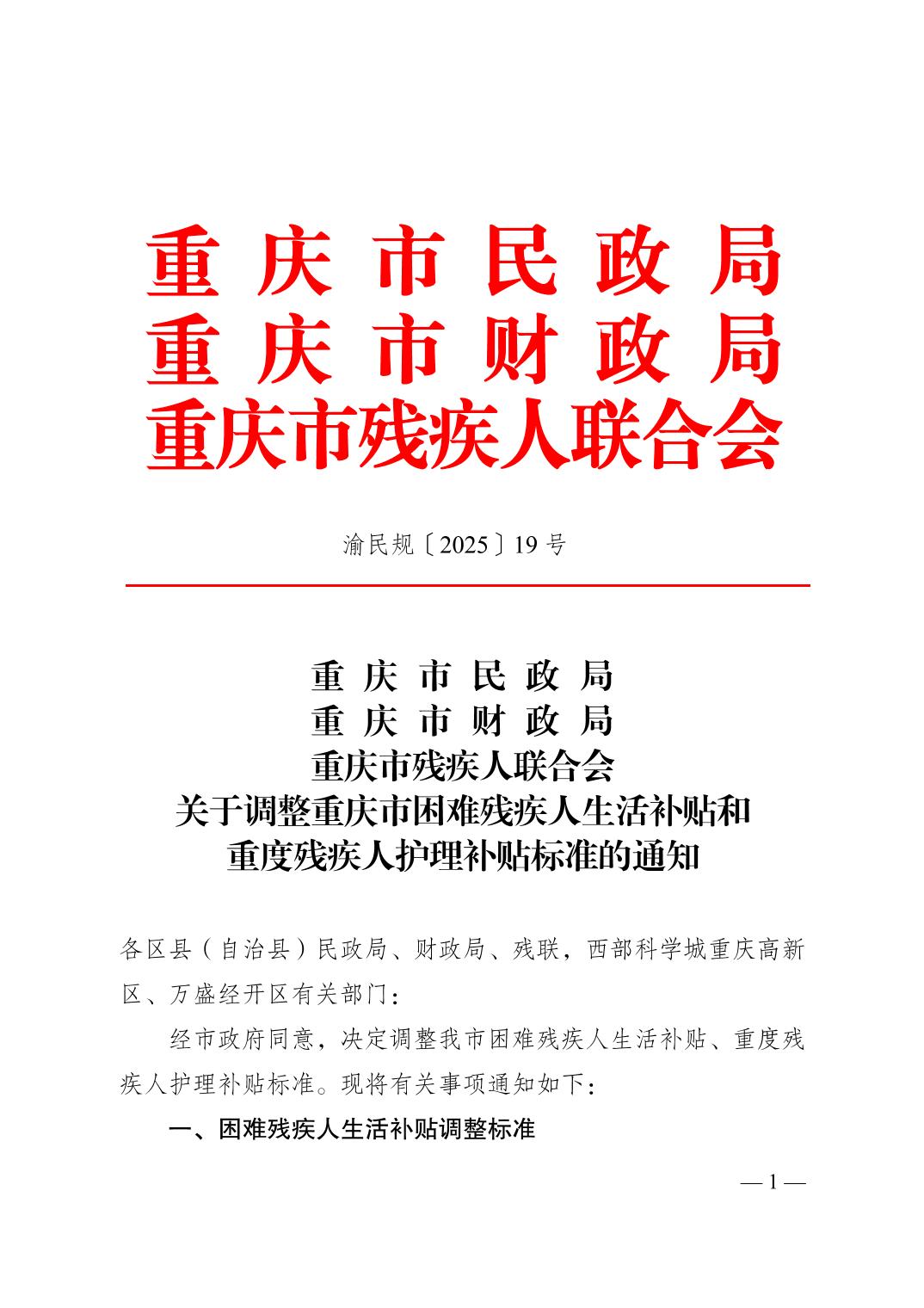 渝民规〔2025〕19号 关于调整重庆市残疾人两项补贴标准的通知