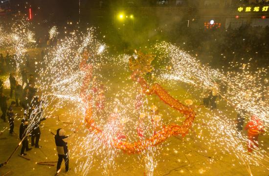 在火烧龙表演的最后,唐帮树和儿子唐家兵将火炉中熔化的铁水舀出,抛打至夜空中,犹如漫天星光,欢呼声响彻云霄。