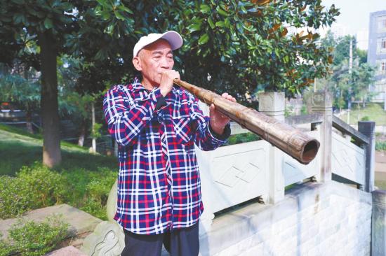 “以前过年,我们当地就喜欢吹竹筒号,大家聚在一起,比谁吹得响、吹得久,场面很热闹、喜庆。”杨世谷今年72岁,老家是大足区龙石镇,他不仅是竹筒号传承人,也是大足薅秧山歌的传承人。在那个艰苦的年代,没有电视、音响,陈世谷最初对音乐的大部分认知都来自父亲和乡民们口中的薅秧歌和竹筒号。