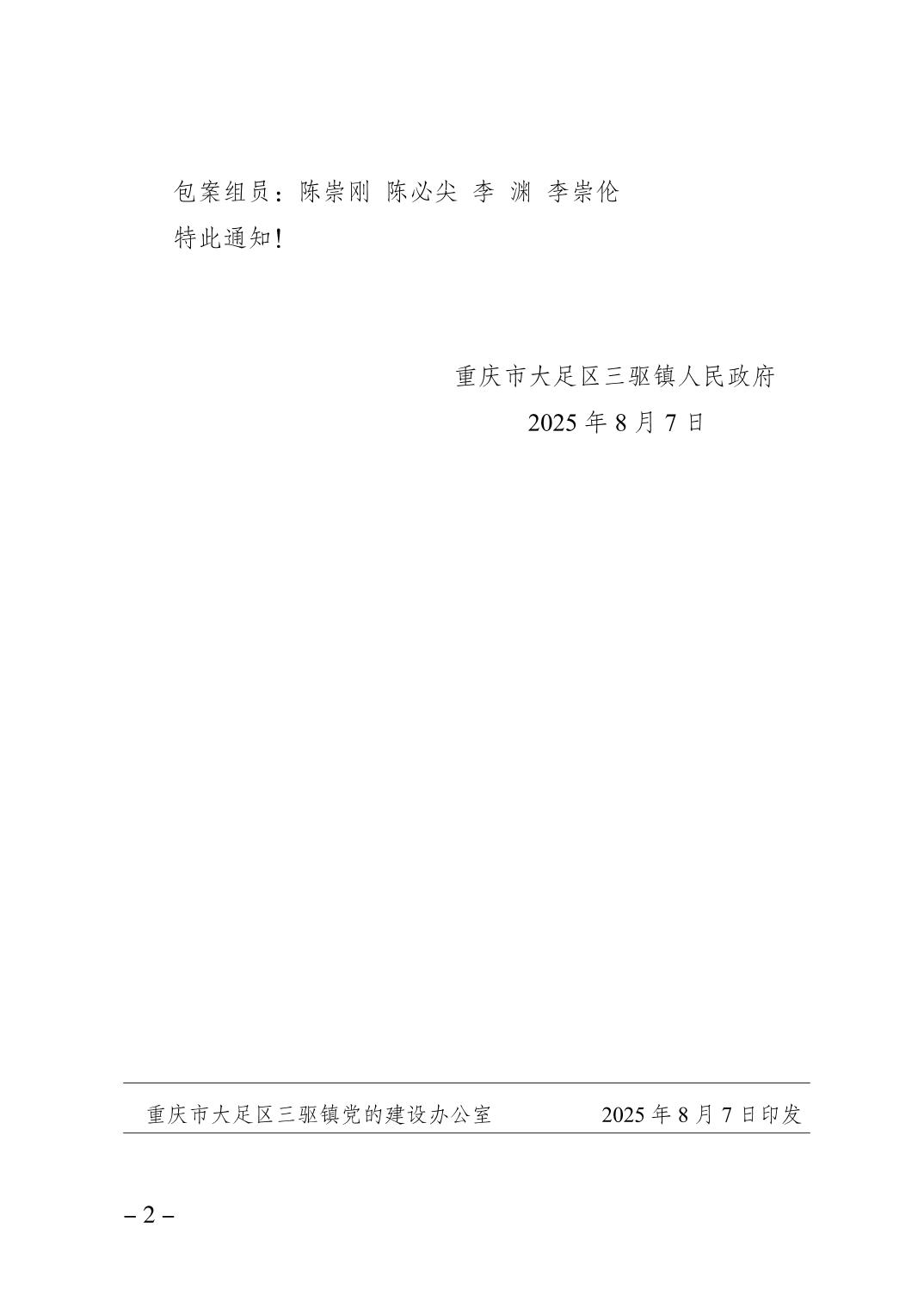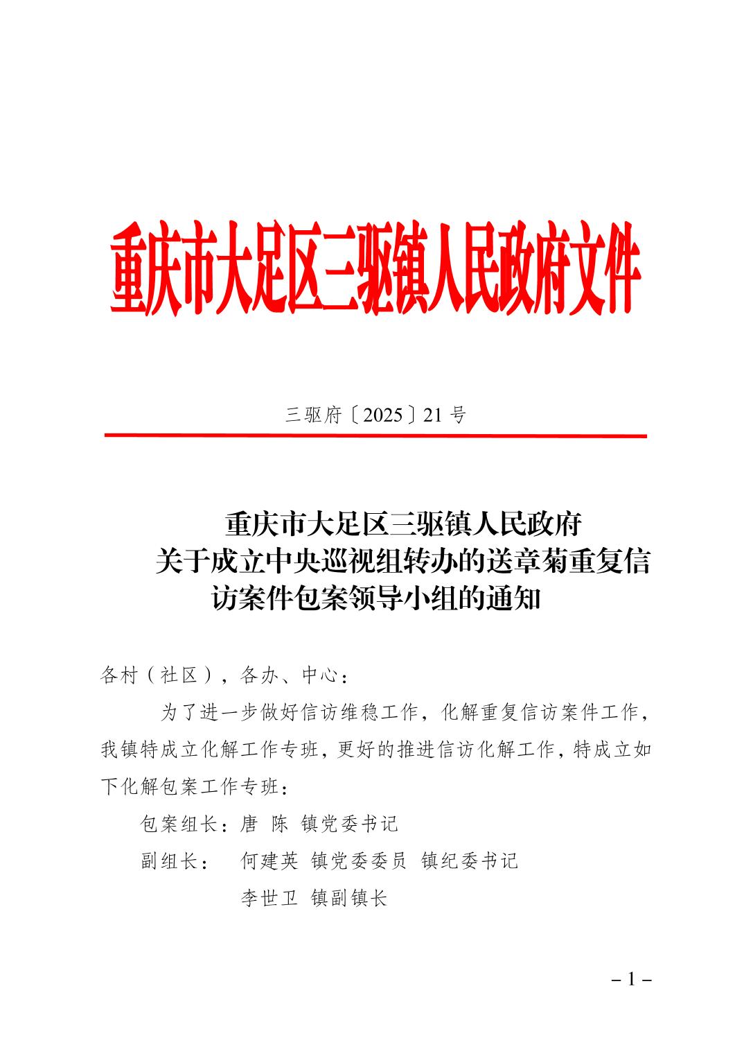 重庆市大足区三驱镇人民政府 关于成立中央巡视组转办的送章菊重复信访案件包案领导小组的通知