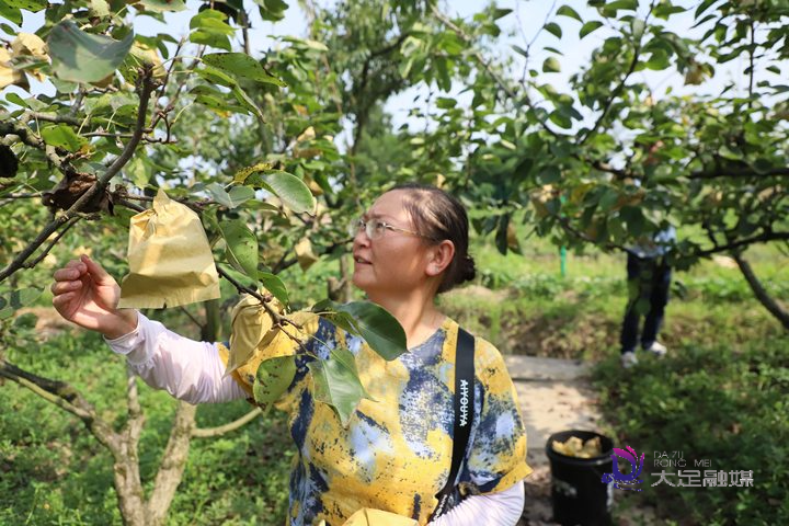 “一般在梨花谢了一个月左右,对果树进行疏果,挑选果型好的留下来,在果子有硬币大的时候就要套袋了。套袋后黄金梨表面就不会长出斑点,长大后形状也比较好看。”罗明玉说。