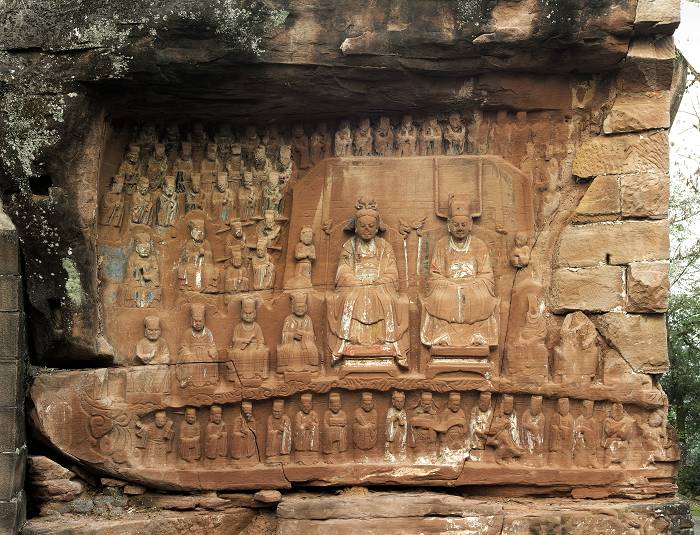 造像以东岳大帝,淑明皇后居中,左右十王相随,下部地狱场景相伴,众侍者环拱布局,反映出公元10——13世纪(宋代)东岳世家在道教神系中的突出地位。