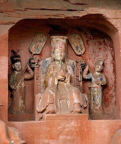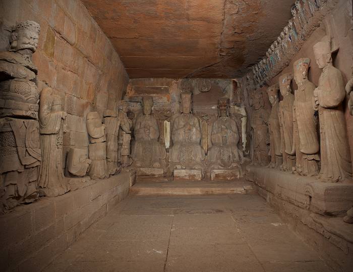 窟内正壁端坐三身帝王像,中为天皇,两侧分别为地皇和人皇。三像皆坐于龙头靠背椅上,头戴高方冠,香袋护耳,着宽袖大袍,双手在胸前捧笏。在三像头上方的圆形龛内,刻道教的“三清”尊神。在三皇像两侧,左侧站立捧笏官员像,右侧站立抱圆筒状器物侍女。