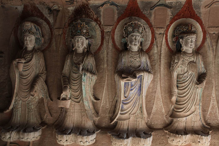 窟口左右刻四大天王,形体高大,神情威武,身着甲胄;或一头二臂,或三头六臂,手持鞭、剑、轮、弓等法器,尽责护卫道场。