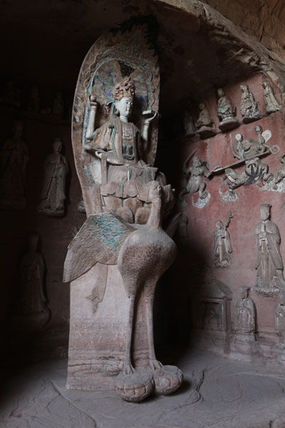 主尊孔雀明王,面容秀丽,神情庄严;一头四臂,头戴花冠,冠带下垂贴胸;胸饰璎珞,内着僧祇支,外着短袖披巾,手臂赤裸,手腕戴镯,身饰飘带,四手握持法器,或拂子,或经卷,或荷苞,或宝珠,端坐于孔雀背负的莲台之上。明王身后,有舟形的火焰纹背光,向上稳健地支撑着窟顶。