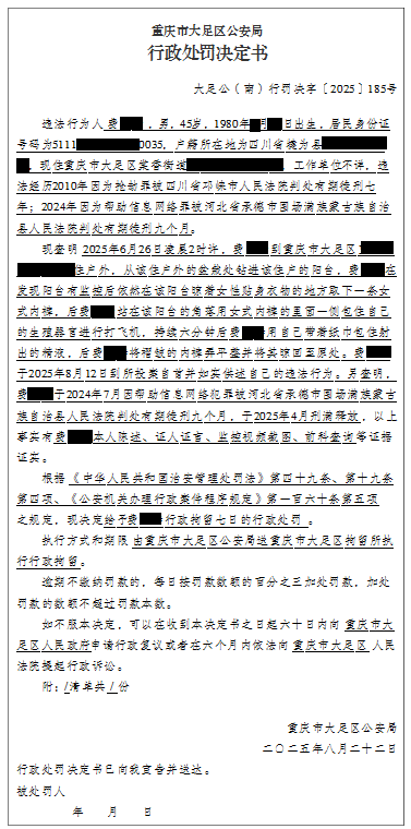 | [ 索引号 ] | 11500111709312781Q/2025-01313 | [ 发文字号 ] | 大足公(南)行罚决字〔2025〕185号 |