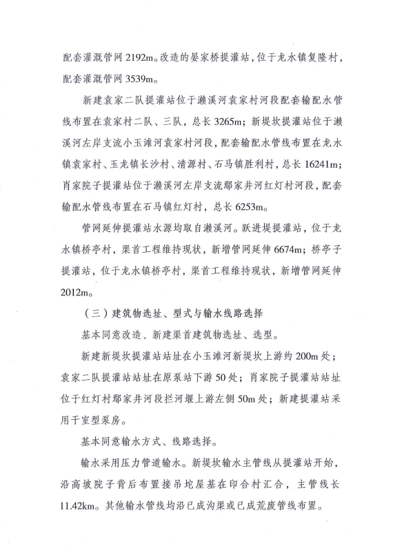 设计灌溉面积2022亩,本次设计新建肖家院子提灌站,新建灌溉管网,合计管长6252m。包括:新建DN300*5SP-TNK耐磨涂塑复合管904m、DN250-1.0Mpa PE管629m、DN200-1.0Mpa PE管1291m、DN160-1.0Mpa PE管3428m,新建分水井24座。