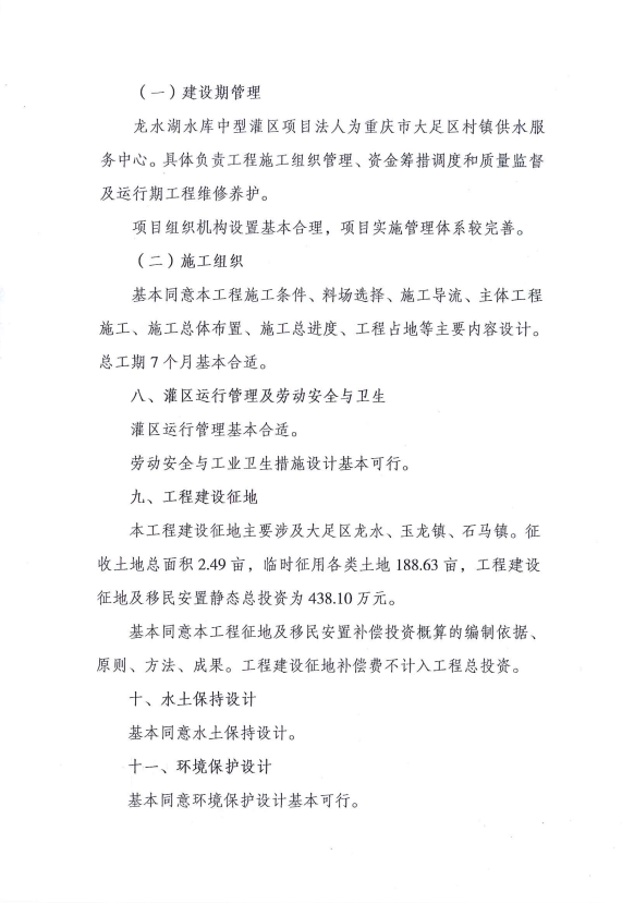 你中心《关于审批重庆市大足区龙水湖水库中型灌区续建配套与节水改造项目实施方案的请示》(大足村镇供水中心文〔2024〕4号)及有关资料收悉,结合大足区水利局组织专家对该工程的评审意见,经研究,同意该工程实施方案,现批复如下: