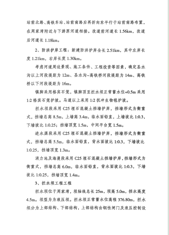 防洪护岸工程上起罗庄大桥下游,先向西至规划西纵线东侧布置,然后转南平行西纵线布置,依次下穿站前北路、高铁车站、站前南路后再折向东平行于站前南路布置,在周家湾附近与下游原河道相接,全长2.51km,其中左岸长度1.21km,右岸长度1.30km;圣水沟以上河段堤距为12m、圣水沟~高铁桥河段堤距为14m、高铁桥以下河段堤距为16m。