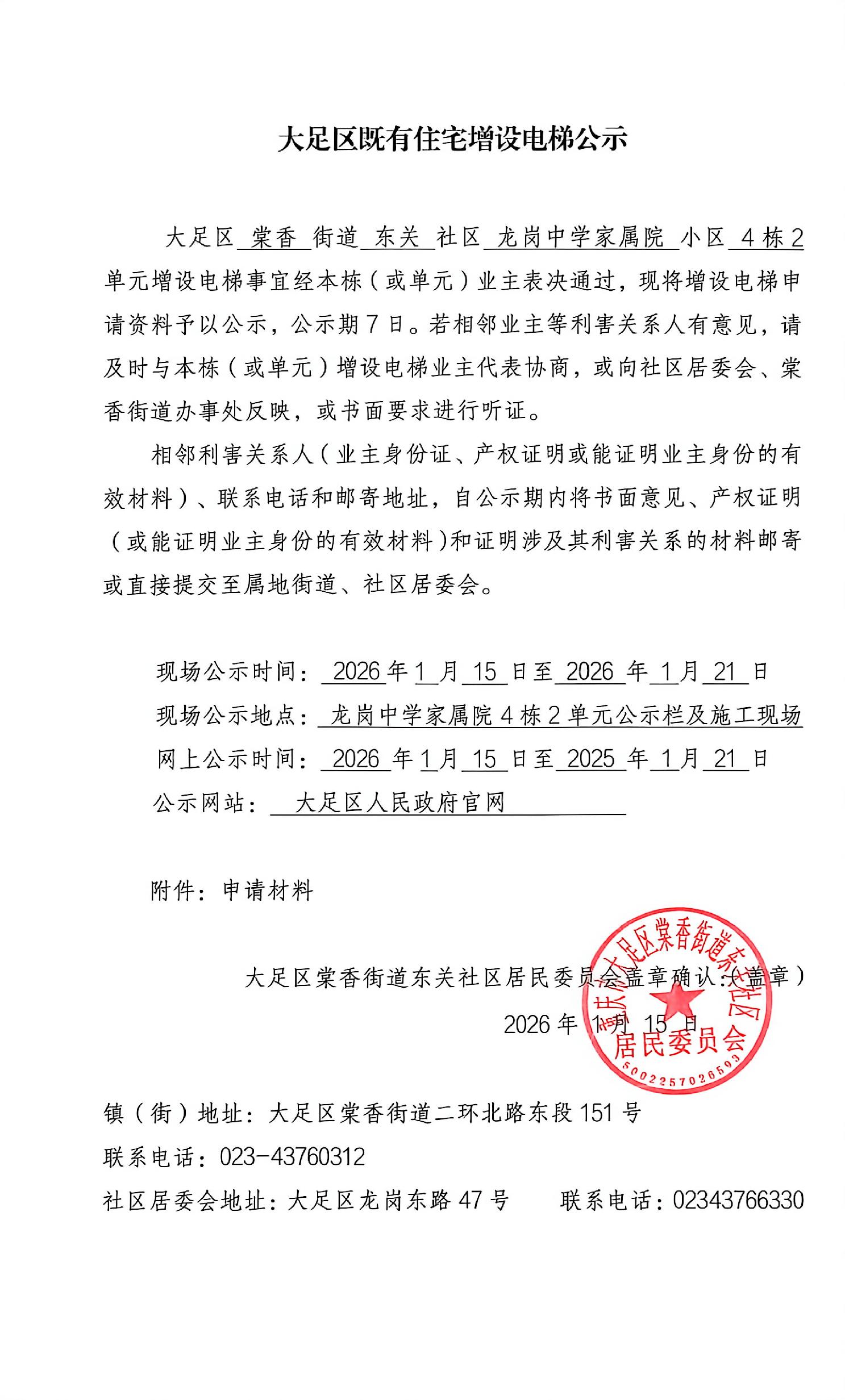 大足区既有住宅增设电梯公示(龙岗中学家属院4栋2单元)